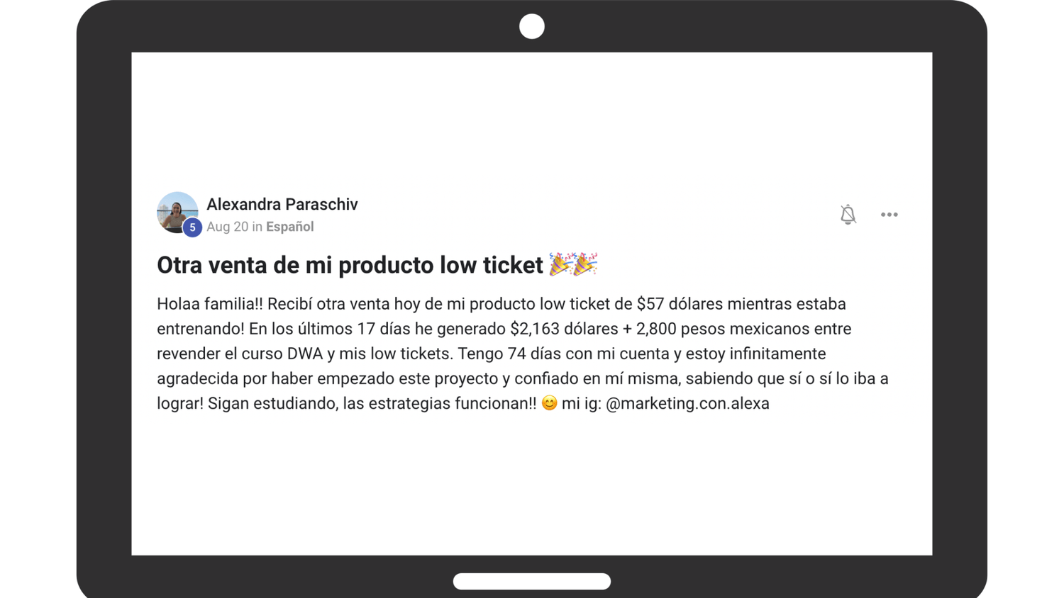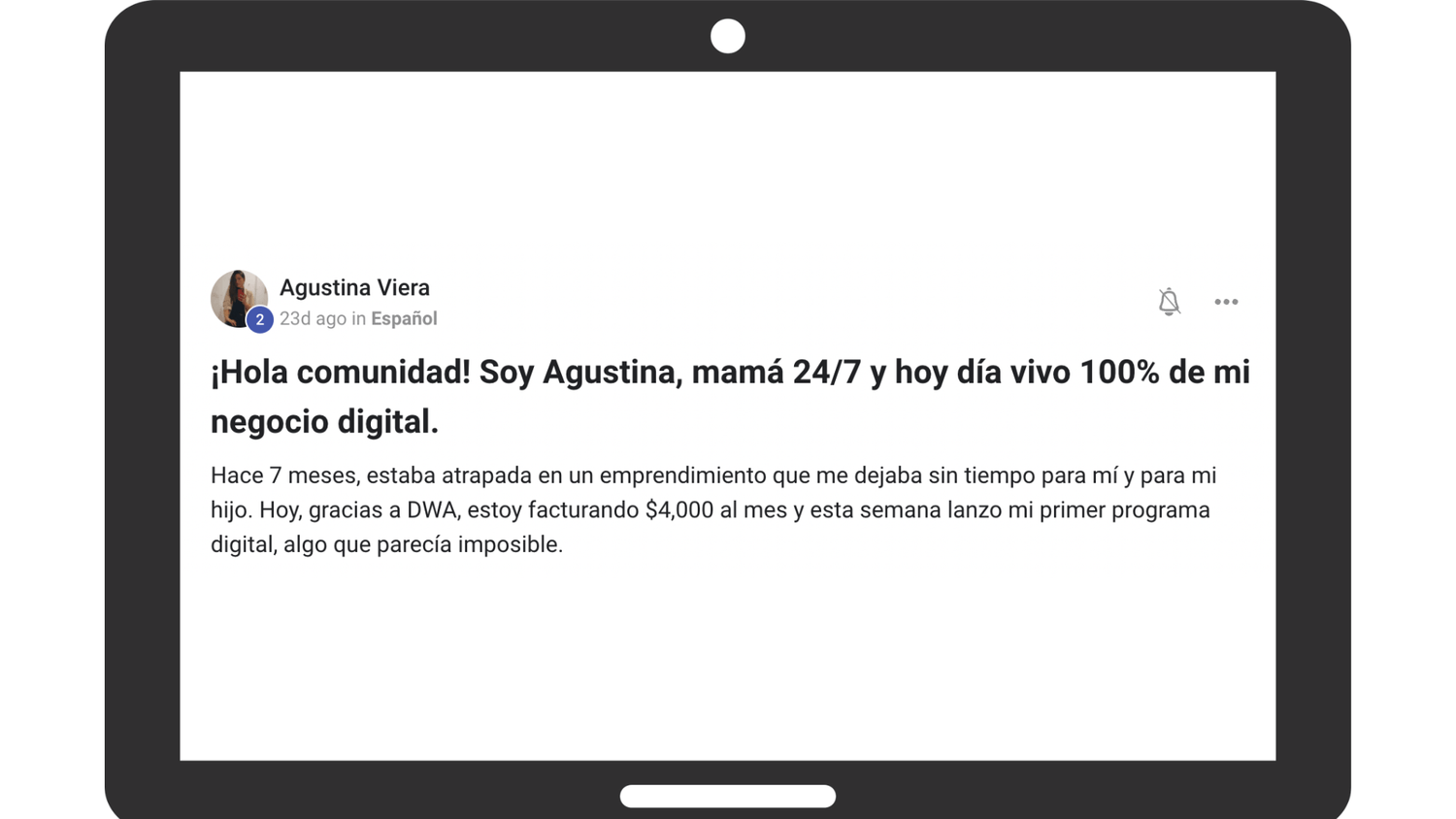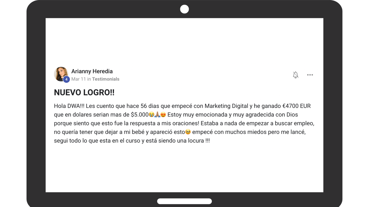 Entiendo perfectamente por lo que estás pasando! Yo también he estado en esa misma situación y sé que puede dar miedo. Pero hay algo que asusta aún más: no arriesgarse y quedarse con la duda del "¿qué hubiera pasado si...?". Si no estuviera convencida de que este curso puede transformar tu vida, no lo compartiría contigo. Seré sincera contigo, y quiero decirte que sí, si hay una forma de salir de donde te encuentras. Solo necesitas enfocarte y ser decidido. Recuerda que esto no se construye de la noche a la mañana, y es importante que lo sepas desde el principio. No quiero hacerte promesas vacías ni decir que vas a ganar dinero mañana. Quiero que quere claro de que cada persona tiene su propio proceso. Sin embargo, lo que sí puedo garantizarte es que este curso transformará tu mentalidad de formas sorprendentes. DWA te brindará las herramientas y conocimientos necesarios para dar el dar el primer paso hacia la creación de tu propio negocio digital. Con dedicación, podrás ver resultados reales y sostenibles.